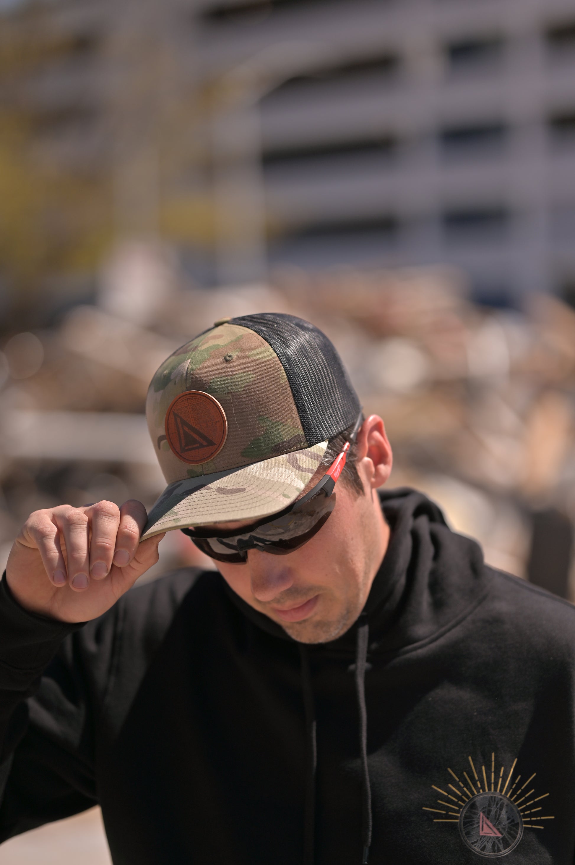 Analemma Squared leather patch logo on a Multicam Green/Black Snapback.